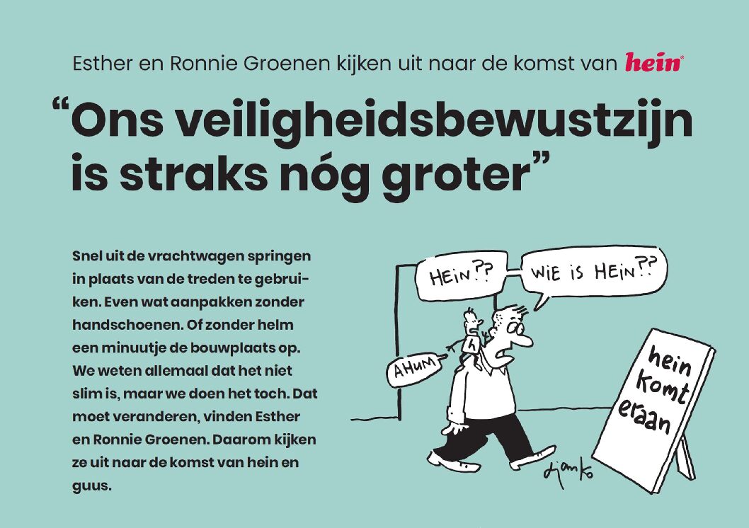 Bij Groenen zetten we in op ‘Heinen’ en willen we de ‘Guzen’ aanpakken en bespreekbaar maken. Elkaar aanspreken en samen praten over de excuses die we in ons hoofd hebben. Op die manier manier willen we het veiligheidsbewust binnen ons bedrijf vergroten en daarmee de veiligheid.